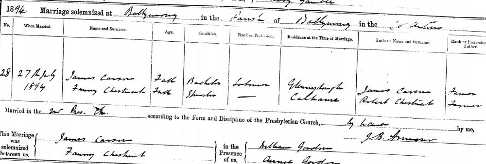 Fanny Matilda CHESTNUTT, daughter of Samuel GRAY and Mary CHESTNUTT, was born on February 19, 1872 in Calhame. She married James CARSON on July 27, 1894 in Trinity Presbyterian Church Ballymoney. She died. |