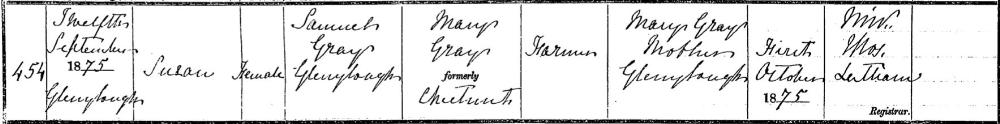 Susan GRAY, daughter of Samuel GRAY and Mary CHESTNUTT, was born on September 12, 1875 in Glenelough Ballymoney. She married William ELLIOTT on November 13, 1896 in St James Ballymoney. She died. |