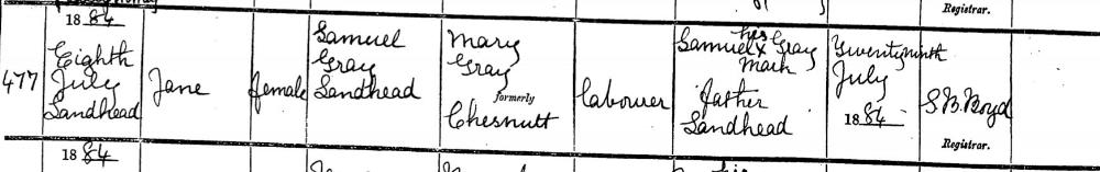 Jane GREY, daughter of Samuel GRAY and Mary CHESTNUTT, was born on July 8, 1884 in Landhead. She died. |