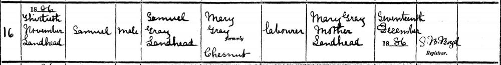 Samuel GREY, son of Samuel GRAY and Mary CHESTNUTT, was born on November 30, 1886 in Landhead. He died. |