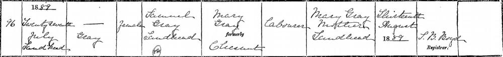 Unnamed GRAY, daughter of Samuel GRAY and Mary CHESTNUTT, was born on July 27, 1889 in Landhead. She died on August 1, 1889 in Dunaghy. |