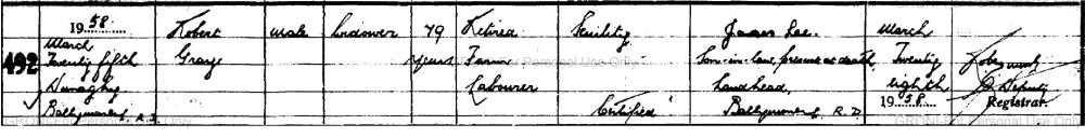 Mary CHESTNUTT, daughter of Robert CHESTNUTT (c. 1812-1889) and Fanny LYONS (c. 1811-1875), was born circa 1855 in BALLYMONEY County Antrim Northern Ireland. She died on January 17, 1919 in Dunaghy. She and Samuel GRAY had the following children: |