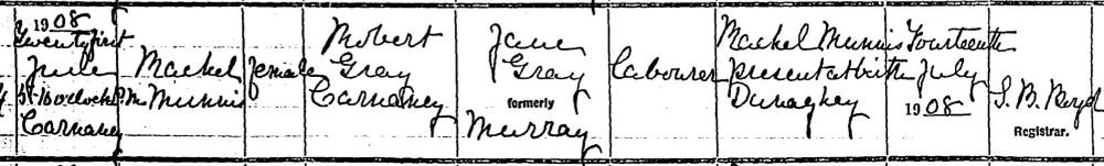 Rachel Munnis GRAY, daughter of Robert GRAY and Jane MURRAY, was born on June 21, 1908 in Carnately Ballymoney. |