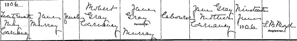 Jane Murray GRAY, daughter of Robert GRAY and Jane MURRAY, was born on May 27, 1906 in Carnately Ballymoney. |